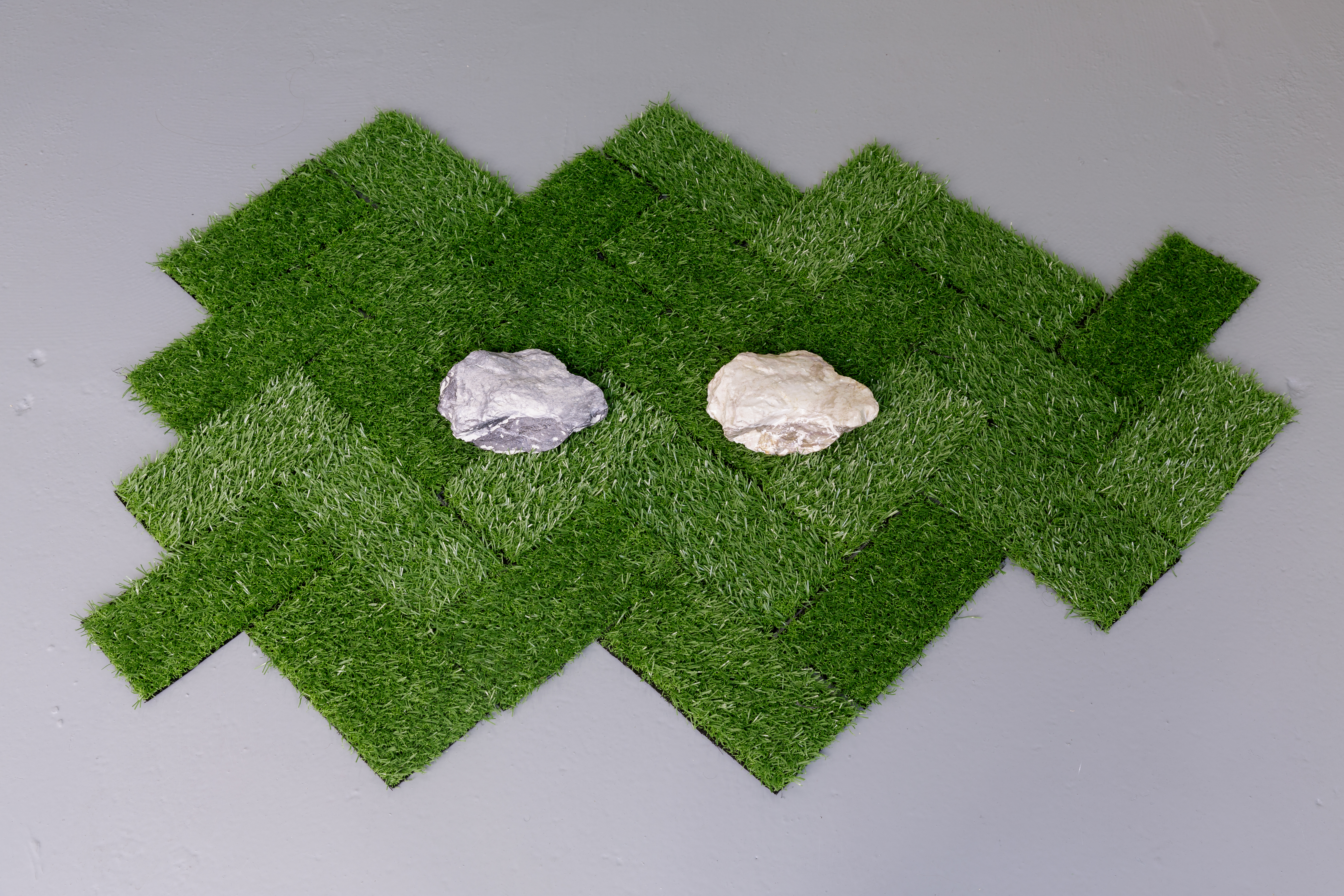 A thing that was a thing that was a thing, 2017, porcelain casts of kaolin* rock, each covered in a digital image of the rock’s surface, on faux grass.
